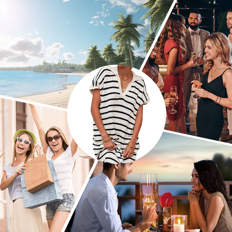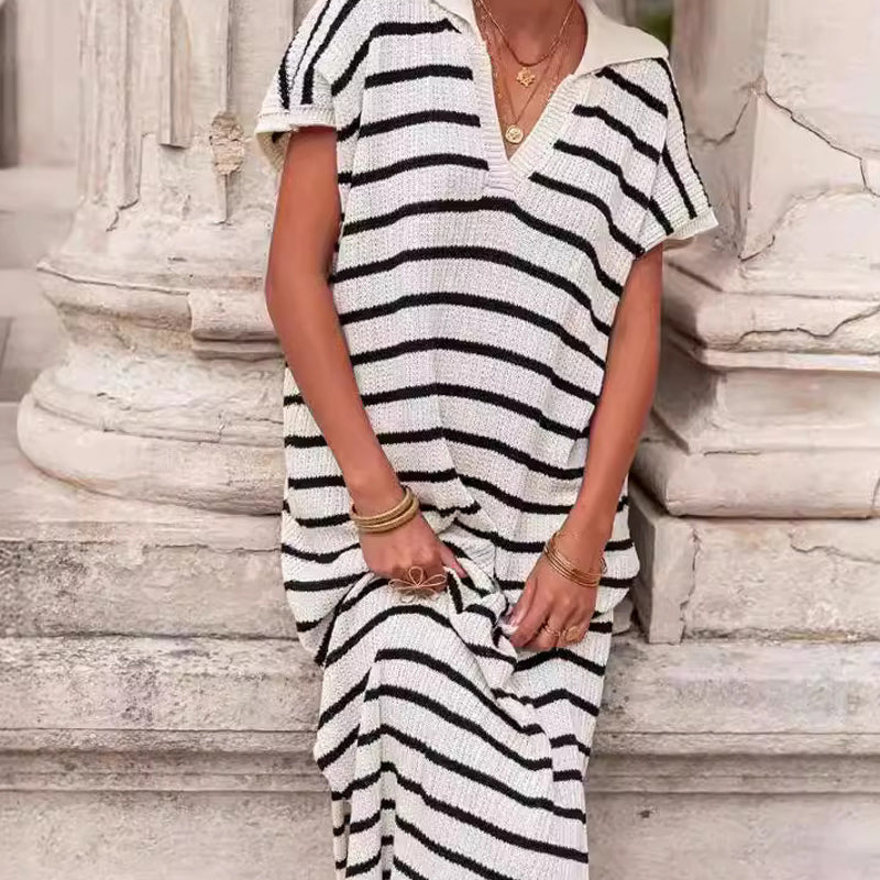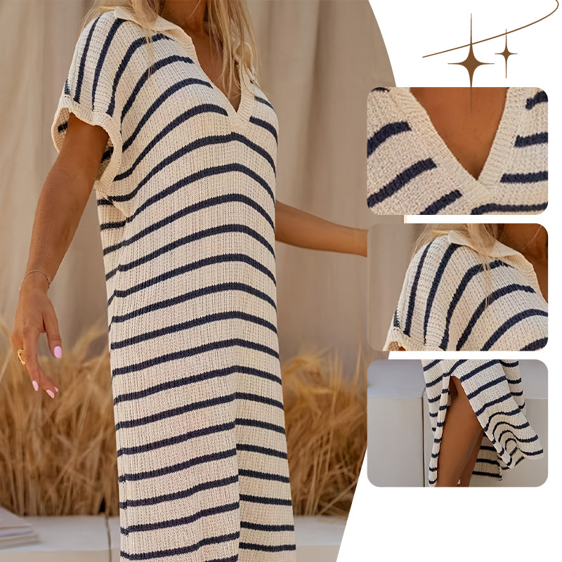 This dress features a flattering V-neckline and a distinctive split lapel design that adds a modern twist to classic stripes.