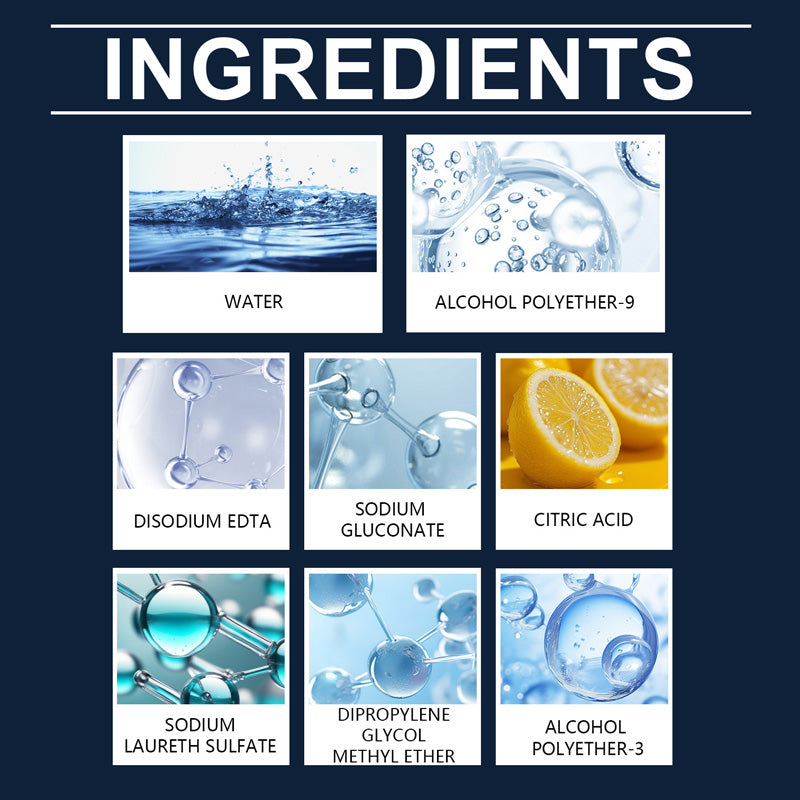 Product Ingredients: Water, Alcohol Polyether-9, Disodium Edta, Citric Acid, Sodium Laureth Sulfate, Dipropylene Glycol Methyl Ether, Alcohol Polyether-3